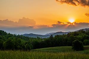 A vibrant summer sunset over the hills of Pickens County, South Carolina.